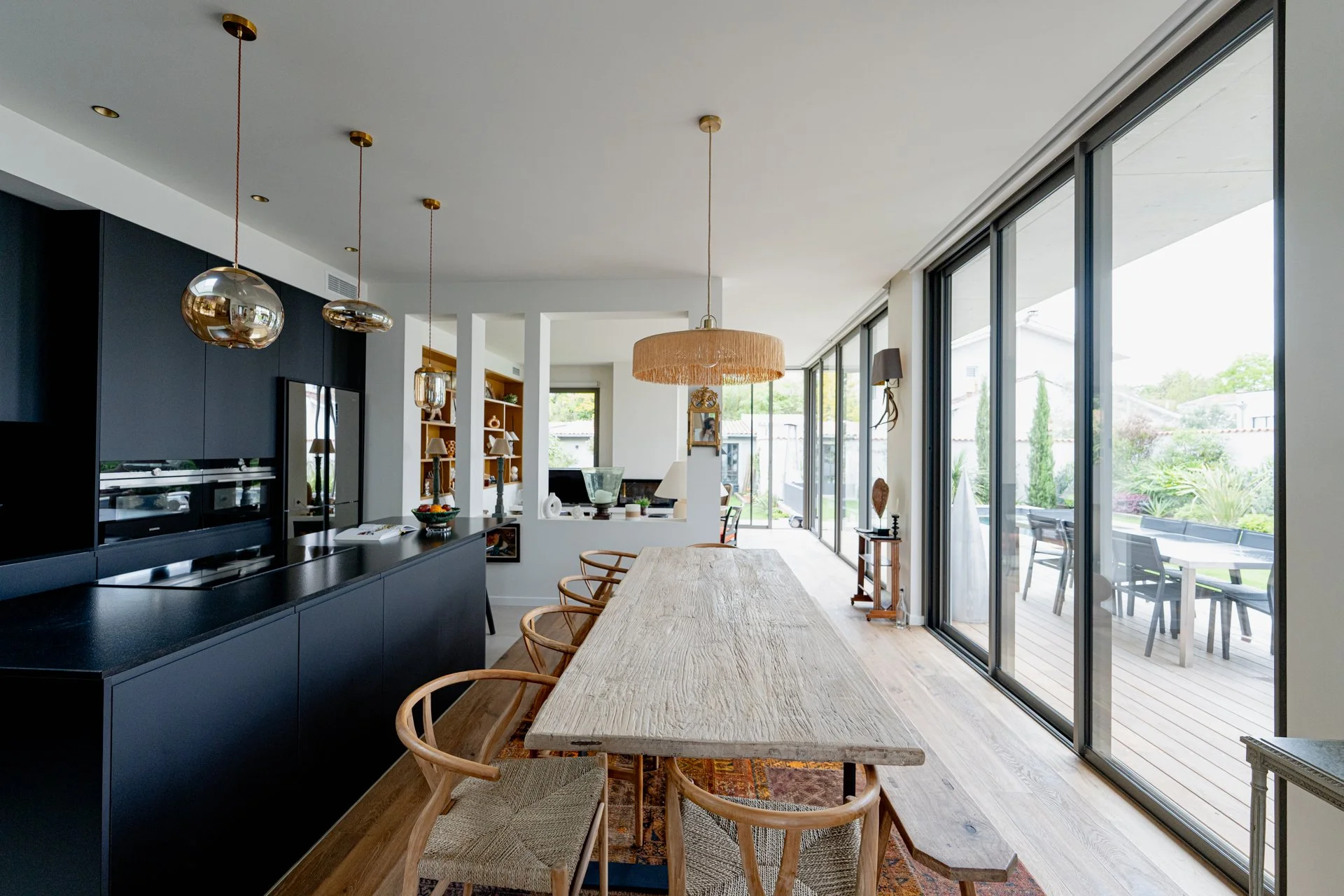 La cuisine, nichée dans l’extension au style résolument contemporain, se dévoile dans une élégante monochromie noire, où chaque détail a été pensé avec précision.